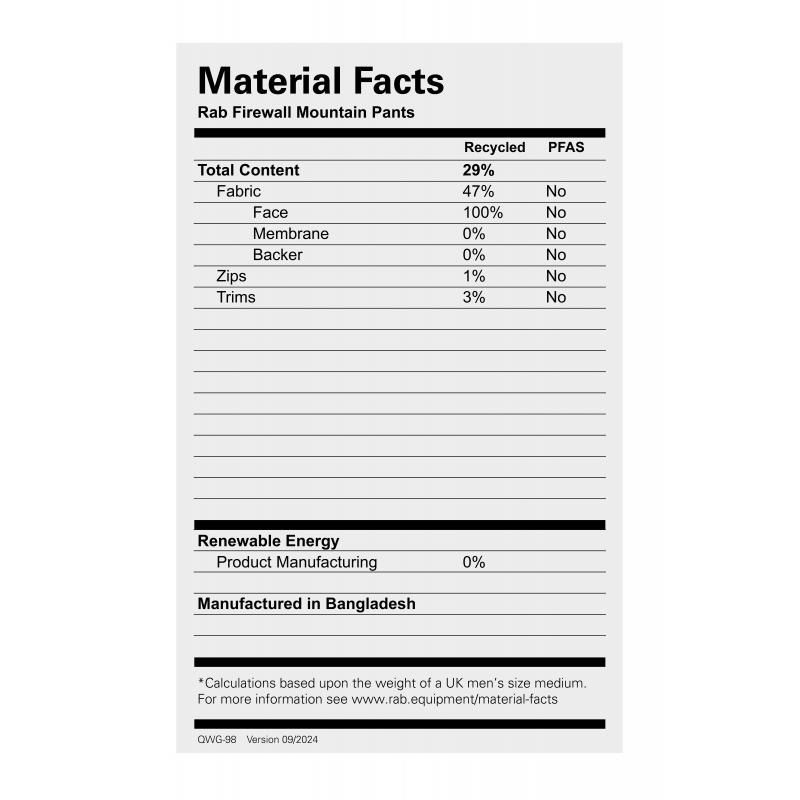 Rab Firewall Mountain Pants er en teknisk og lett skallbukse som gir solid beskyttelse mot regn og vind på tur i fjellet. Med slitesterkt Pertex® Shield, fullengde ventilasjonsglidelåser og god bevegelsesfrihet er dette et pålitelig valg for både fjellturer, klatring og krevende værforhold.