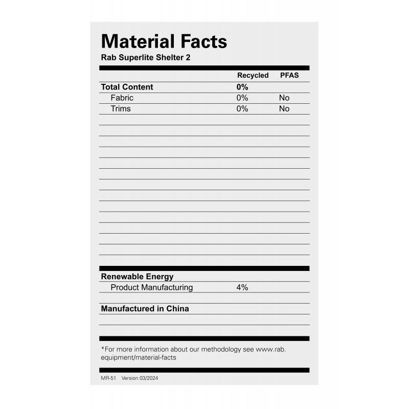 Shelteren er laget i ultralett silikonisert ripstop nylon, som gir en kombinasjon av lav vekt, vind- og vannmotstand og god slitestyrke til nødbruk. Materialet er strippet til et minimum for å holde vekten ekstremt lav og pakkstørrelsen svært liten.